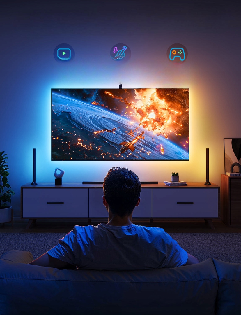 ten inteligentny system oświetlenia telewizora zmienia jasnoś w oparciu o wyświetlane obrazy i synchronizuje się z dźwiękami, tworząccraz Domowego.
