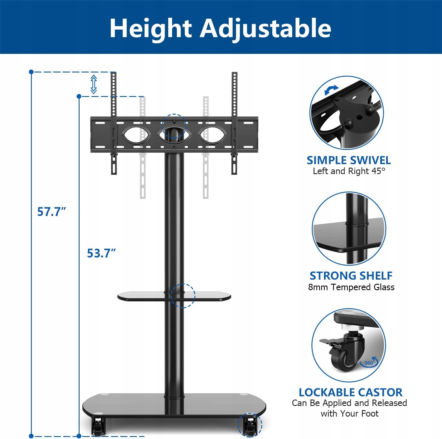 - Хранение и управление кабелем - мобильная телевизионная коляска с металлическим отсеком для мультимедийных элементов может легко разместить кабельную коробку, ноутбуки, DVD-игроки, устройства для потоковой передачи и другие устройства AV, полка также может быть удалена и не использоваться. Телевизионный шкаф имеет металлическую колонну 7,6 см. Две кабельные ручки могут скрывать неприглядные провода и кабели и предоставлять заказанное общее изображение телевизионных стендов.