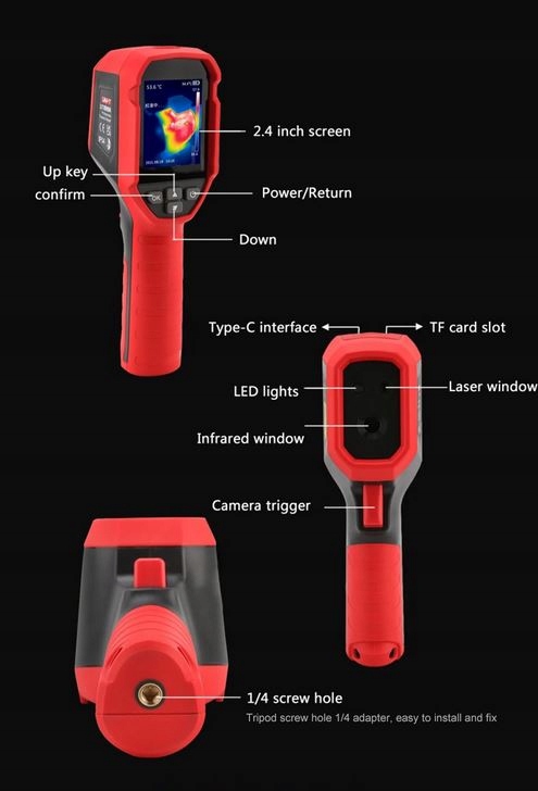 Тепловизионная камера широко используется в медицине, археологии, транспорте, сельском хозяйстве, электронике... Тепловая камера тепловизионная камера сочетает в себе функции измерения температуры поверхности и тепловидения в реальном времени, которые четко отображаются на экране.