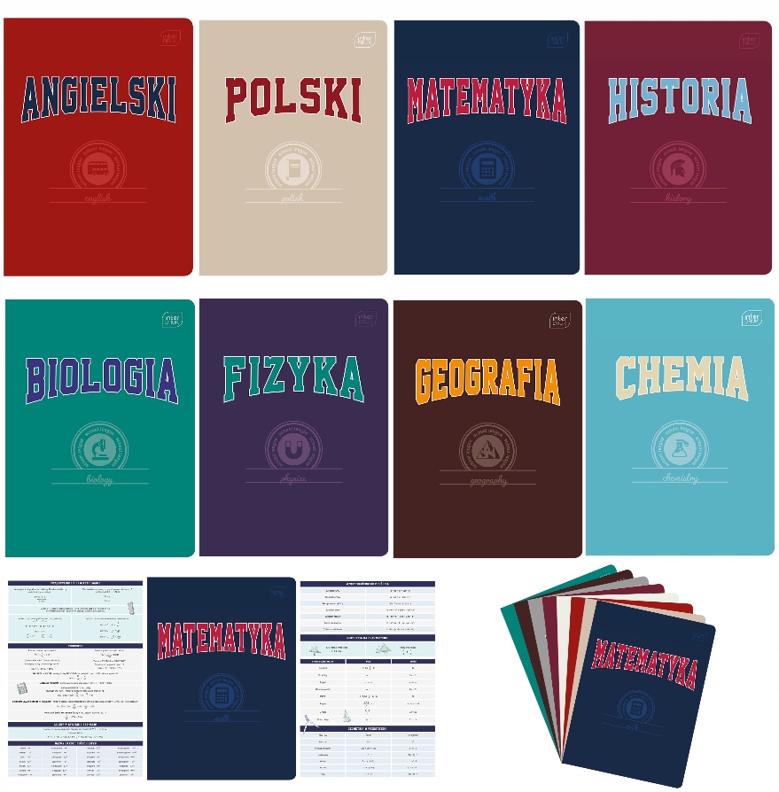 - Записные книжки для: польский, английский, математика, физика, химия, биология, география, история