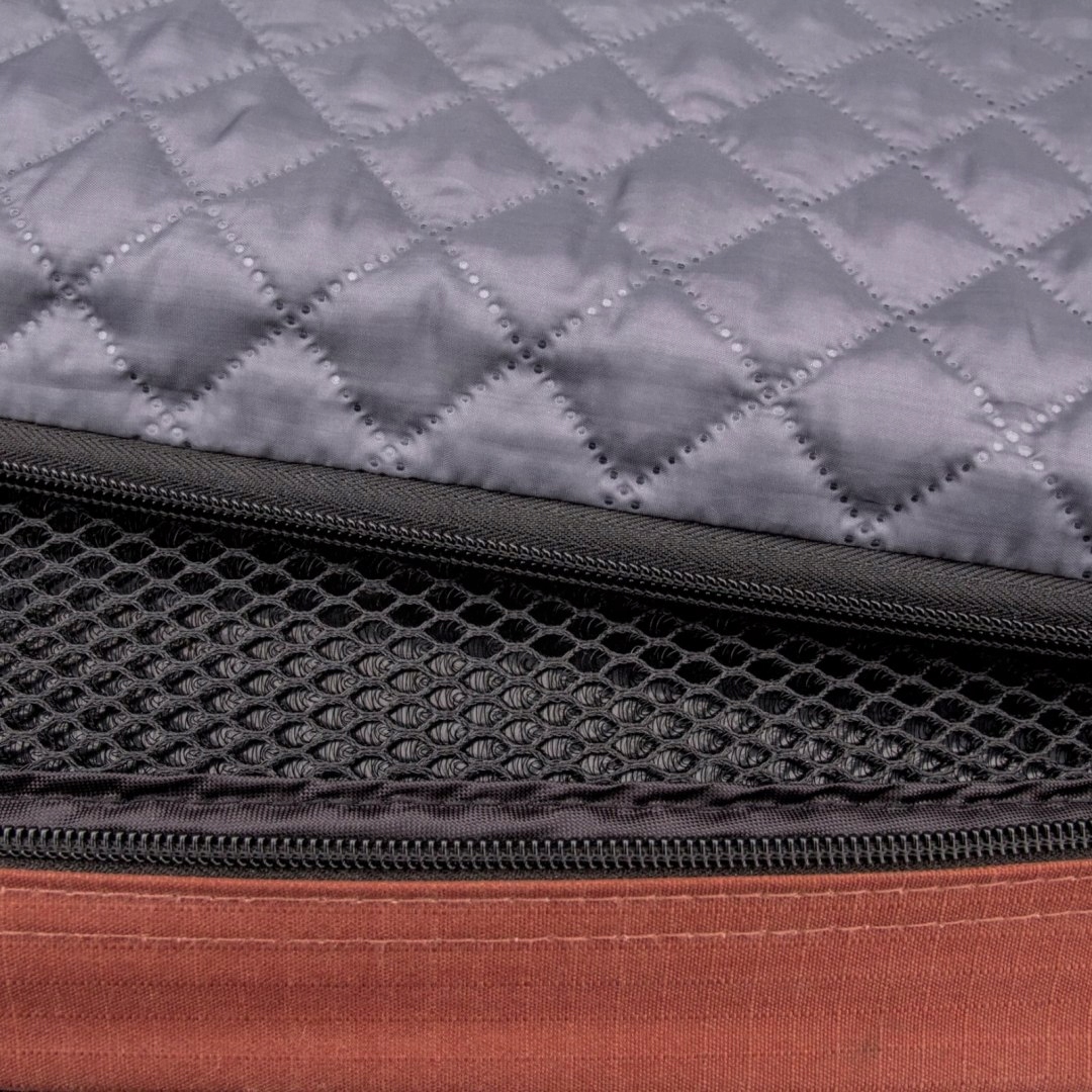 Под матрасом находится антиконденсационный коврик. Это специальный слой, задачей которого является ограничение конденсации водяного пара. В процессе использования палатки, особенно когда температура снаружи ниже, а внутри теплее, влага в виде водяного пара начинает конденсироваться на холодных поверхностях, в том числе и на материале крыши палатки. Это может привести к образованию влаги, плесени и грибков, что в свою очередь может негативно отразиться на состоянии палатки и комфорте ее использования. Антиконденсационный коврик работает по принципу дышащей мембраны. Этот слой имеет небольшие пористые отверстия, которые пропускают водяной пар и в то же время задерживают капли воды.