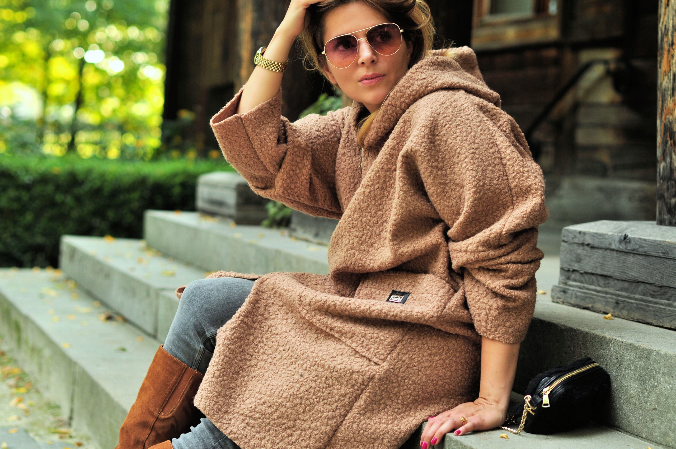 Теплая дубленка с капюшоном.