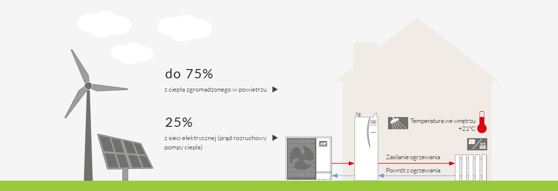 БУДУЩЕЕ И ЭКОНОМИЧНО — внешнее устройство использует тепло, накопленное в окружающем воздухе, и передает его внутреннему устройству. Оттуда он подается в контур отопления. При таком процессе до 75 % общей потребности в энергии покрывается из окружающей среды, а оставшиеся примерно 25 % потребляются тепловым насосом в качестве рабочего тока из электрической сети.
