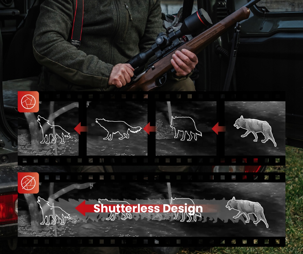 Также на выбор доступны 10 типов прицельной сетки в 5 цветах, режим PiP (картинка в картинке), быстрое прицеливание. функция и алгоритм Hyper-Light + Shutterless 3.0, который устраняет пробелы в изображении, вызванные калибровкой, и улучшает читаемость сцены.