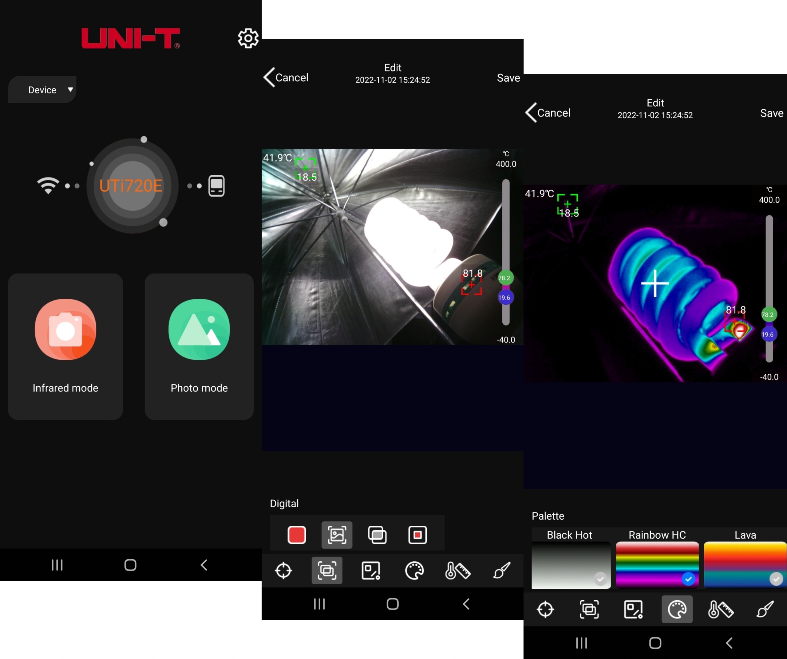 uTI730E — усовершенствованная тепловизионная камера с поддержкой Wi-Fi. Его большой 3,5-дюймовый IPS-экран может четко отображать изображение с 2-мегапиксельной видеокамеры с тепловым разрешением 320×240 или смешанное изображение того и другого. Съемный аккумулятор UTi730E емкостью 5200 мАч также удобен для простой и быстрой замены аккумулятора, обеспечивая бесперебойную работу в течение длительного времени.