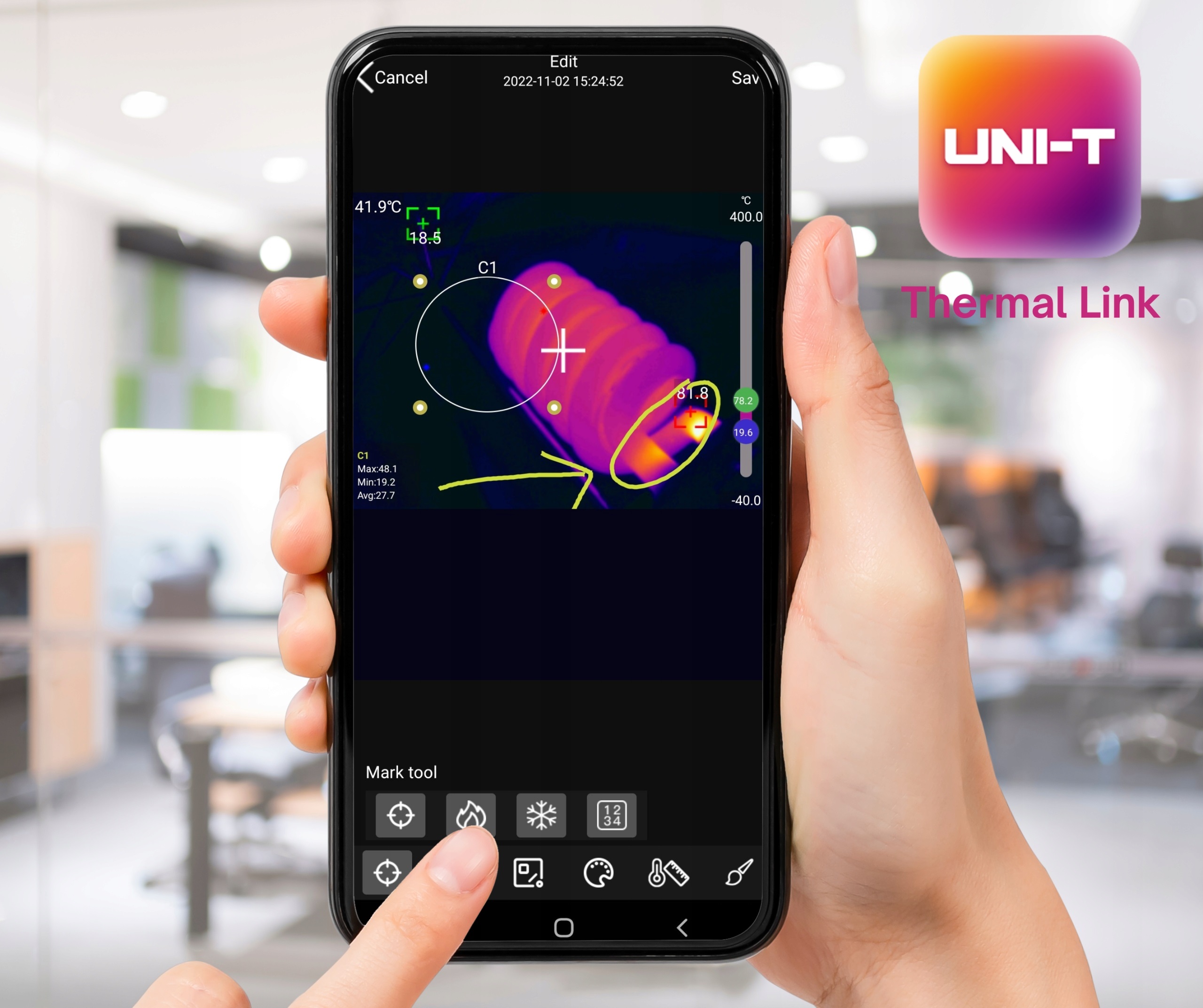 Приложение для телефона позволяет подключать камеру к смартфону или планшету с помощью специального приложения UNI-T Thermal Link