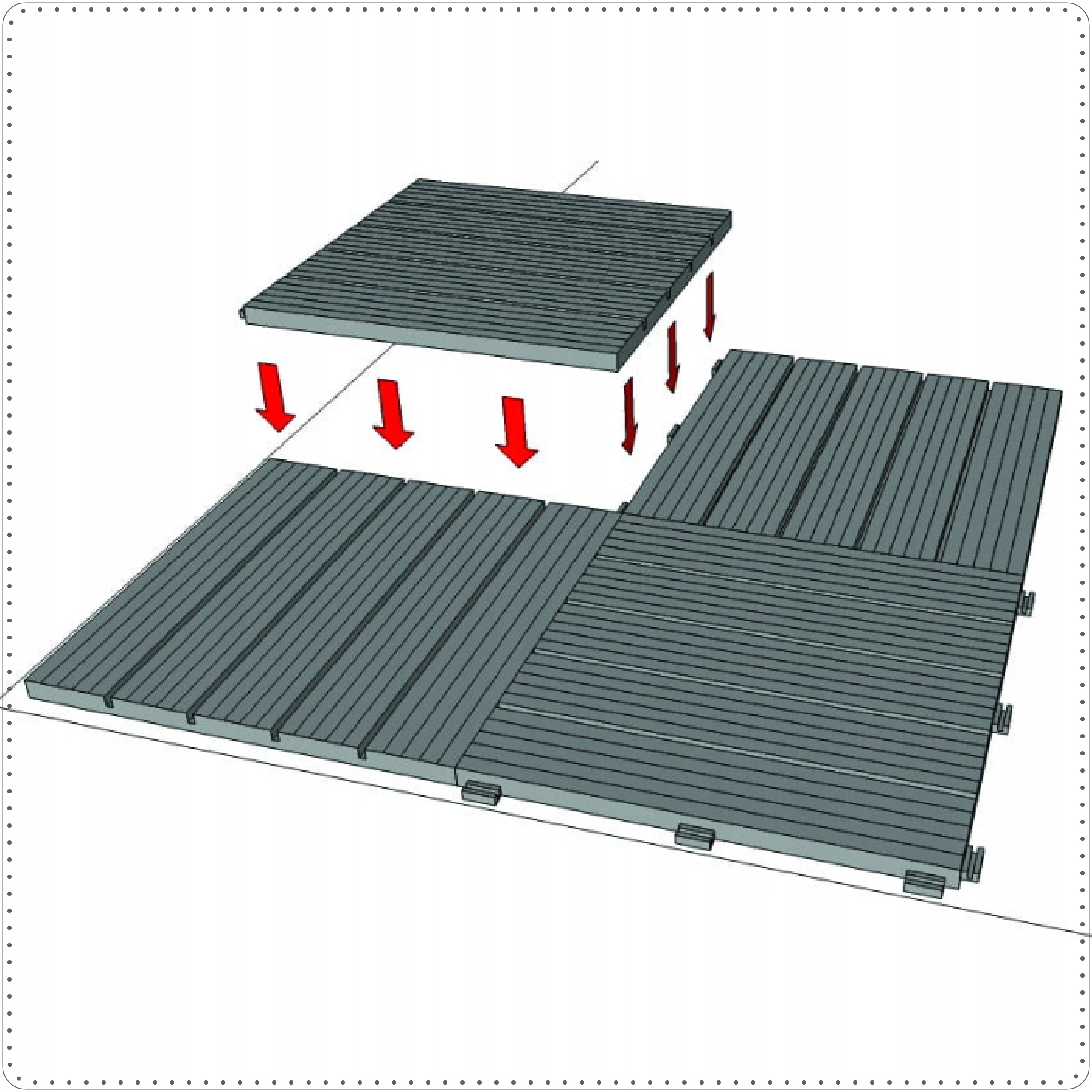 <р>2. Начинайте установкус угла покрываемой поверхности. Поместите первую плитку так, чтобы ее гладкие края были обращены влево и вверх, а стойки — вправо и вниз. Не забудьте оставить примерно 2 мм свободного пространства для каждой плитки (это так называемый расширительный зазор). <р>3. Укладывайте последующие плитки до тех пор, пока предполагаемая поверхность не будет покрыта. Установите крючки. При необходимости используйте резиновый молоток, чтобы было легче нажимать на крючки. <р>4. Как только вы дойдете до стен и препятствий, вам, возможно, придется разрезать плитку, чтобы она лучше подходила к ней. Затем измерьте расстояние между последней плиткой и стеной и отрежьте лишнюю ширину плитки.➔ Плитку можно разрезать на любой желаемый размер (например, резинкой, шариком, ножом). Благодаря особой структуре каркаса плитка не теряет своих свойств после резки – не ломается и не разрушается.