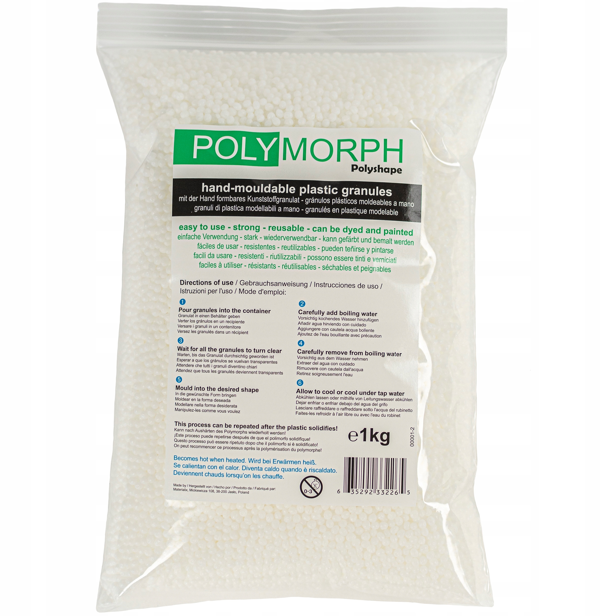 Изделие биоразлагаемо. и нетоксичны. После повторного нагревания в воде он снова становится готовым к формованию. Процесс можно повторять бесконечное количество раз.