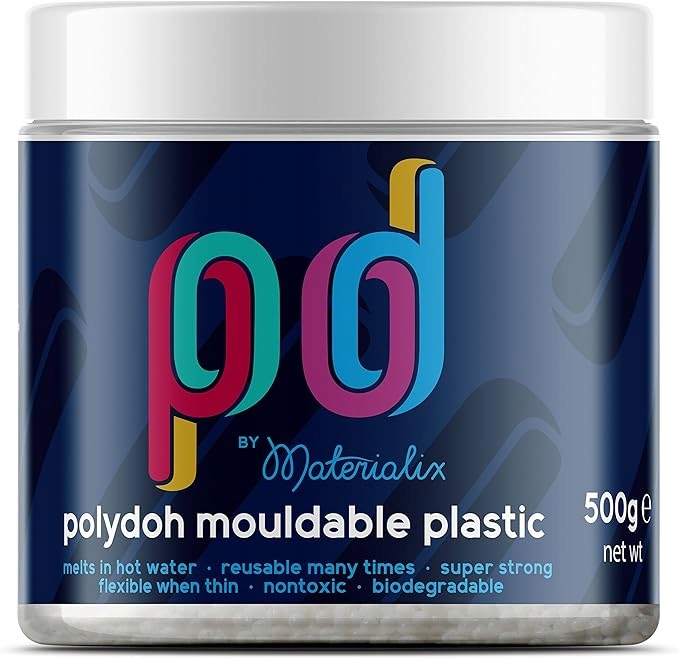 Термоформуемый пластик Polydoh — также известный как Polydoh — представляет собой небольшие шарики из белого пластика. После помещения в горячую воду они становятся прозрачными и пластичными.