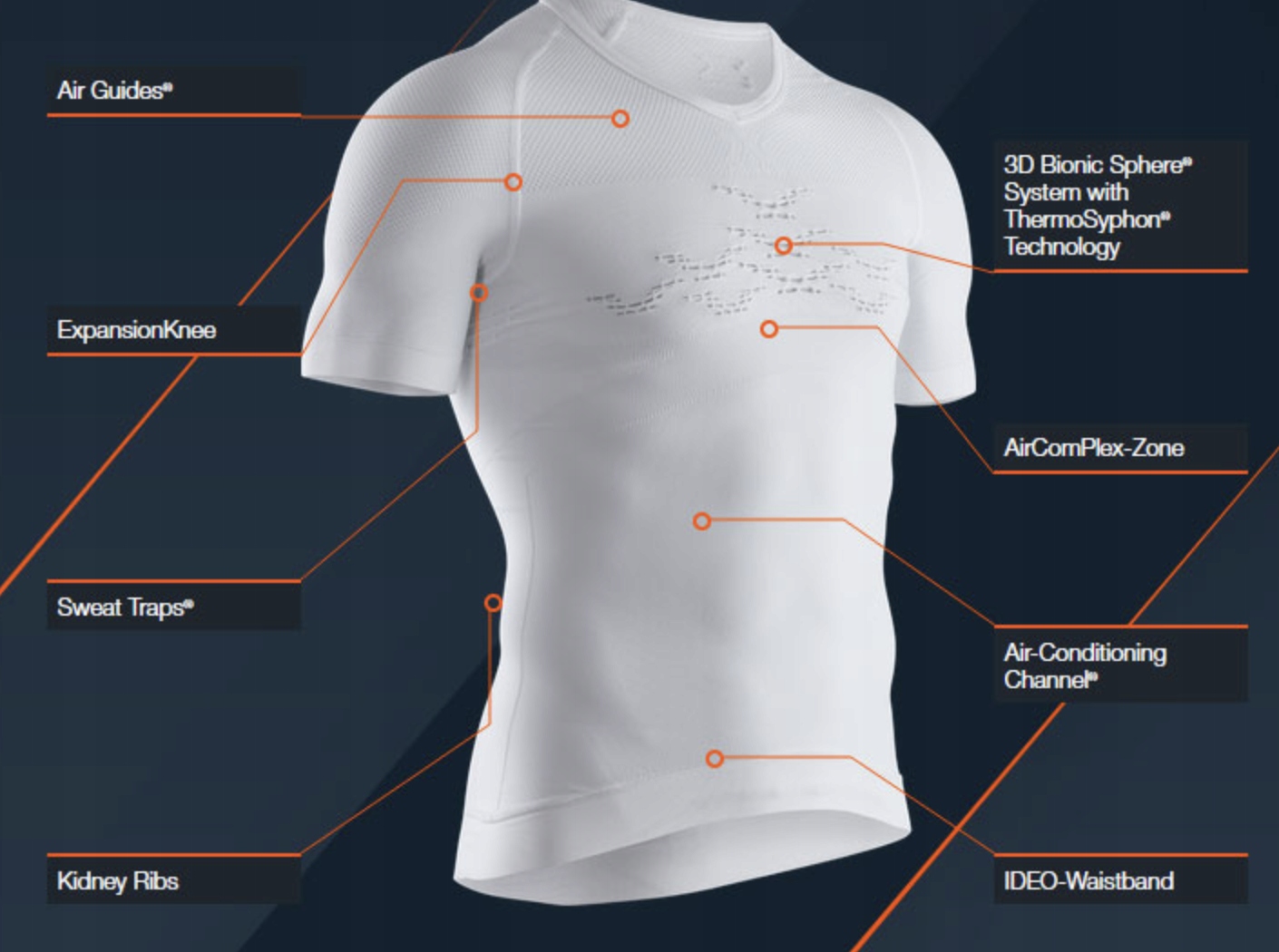 Это система сбора пота, которая улавливает влагу из критических точек тела и отделяет ее от кожи с помощью технологии Evaporation Surface Expander™. Это предотвращает перегрев организма. В свою очередь, технологией, которая решает проблему пота на больших поверхностях тела, является Intercooler. Это трехмерная структура, которая собирает пот и удерживает его непосредственно на коже, позволяя ему испаряться. Эта же технология изолирует мышцы во время отдыха, защищая их от охлаждения.