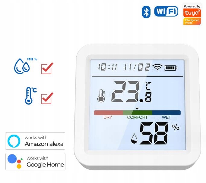 - [Голосовое управление] Этот датчик поддерживает Amazon Alexa и Google Home Assistant. Вы можете проверить текущую температуру и влажность с помощью голоса.