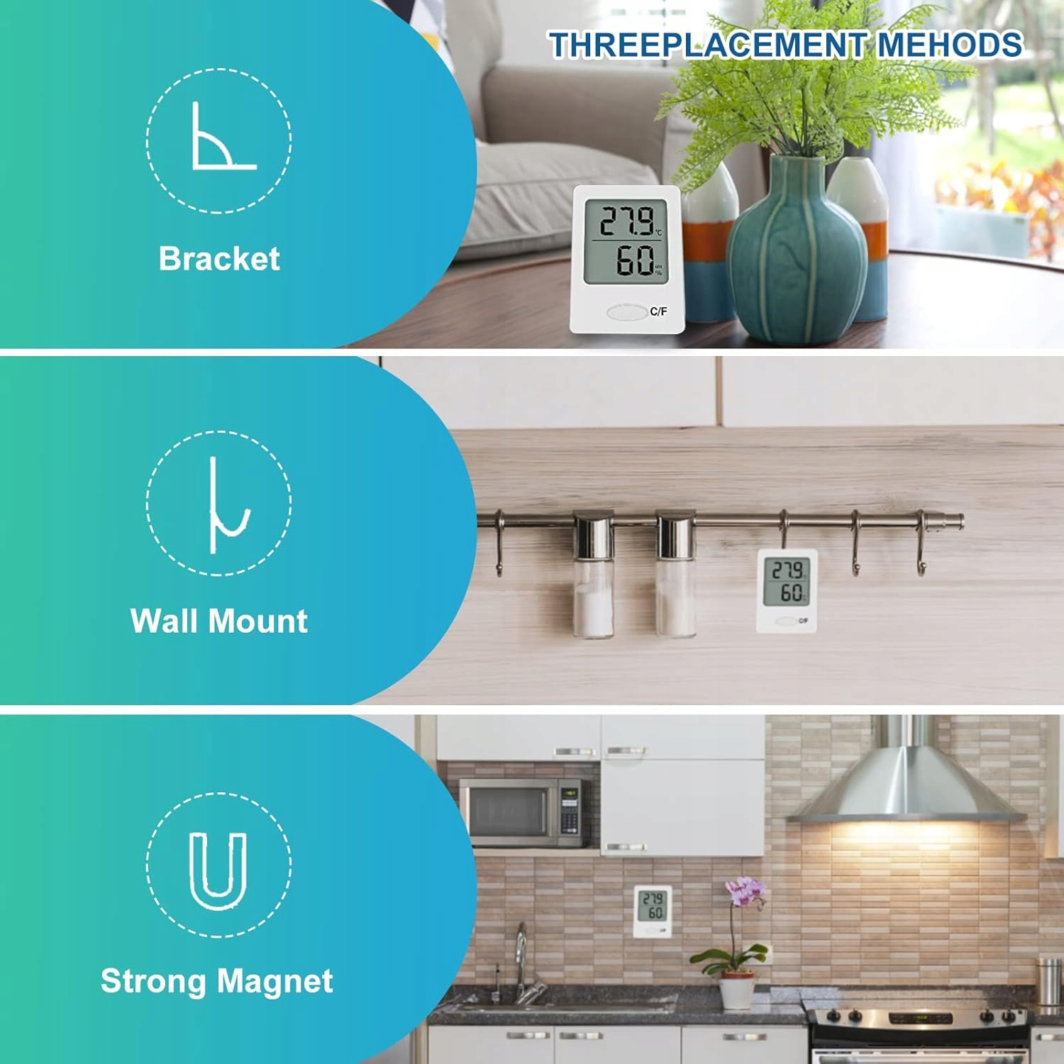 Множество вариантов крепления. Благодаря сильным магнитам, складным ручкам и отверстиям для подвешивания его можно разместить на столе, повесить на стену или установить на холодильник для удобной и элегантной установки. Обеспечивает точные измерения любого помещения (например, кухни, сада, теплицы, подвала, детской комнаты, склада, офиса и т. д.).
