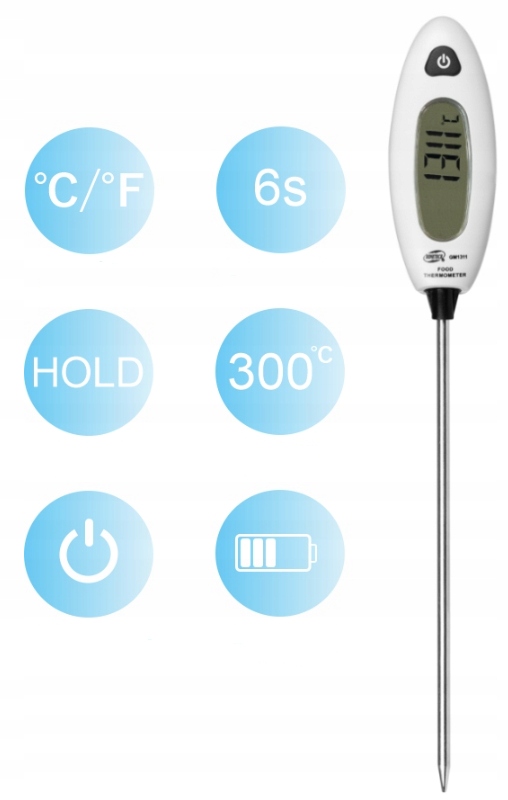 С помощью этого устройства вы можете точно проверять температуру готовящихся блюд. Он идеально подходит для измерения температуры мяса, пирожных, жидкостей и всех других продуктов и напитков. Изделие также используется в лабораториях, фабриках и везде, где требуется контроль температуры.