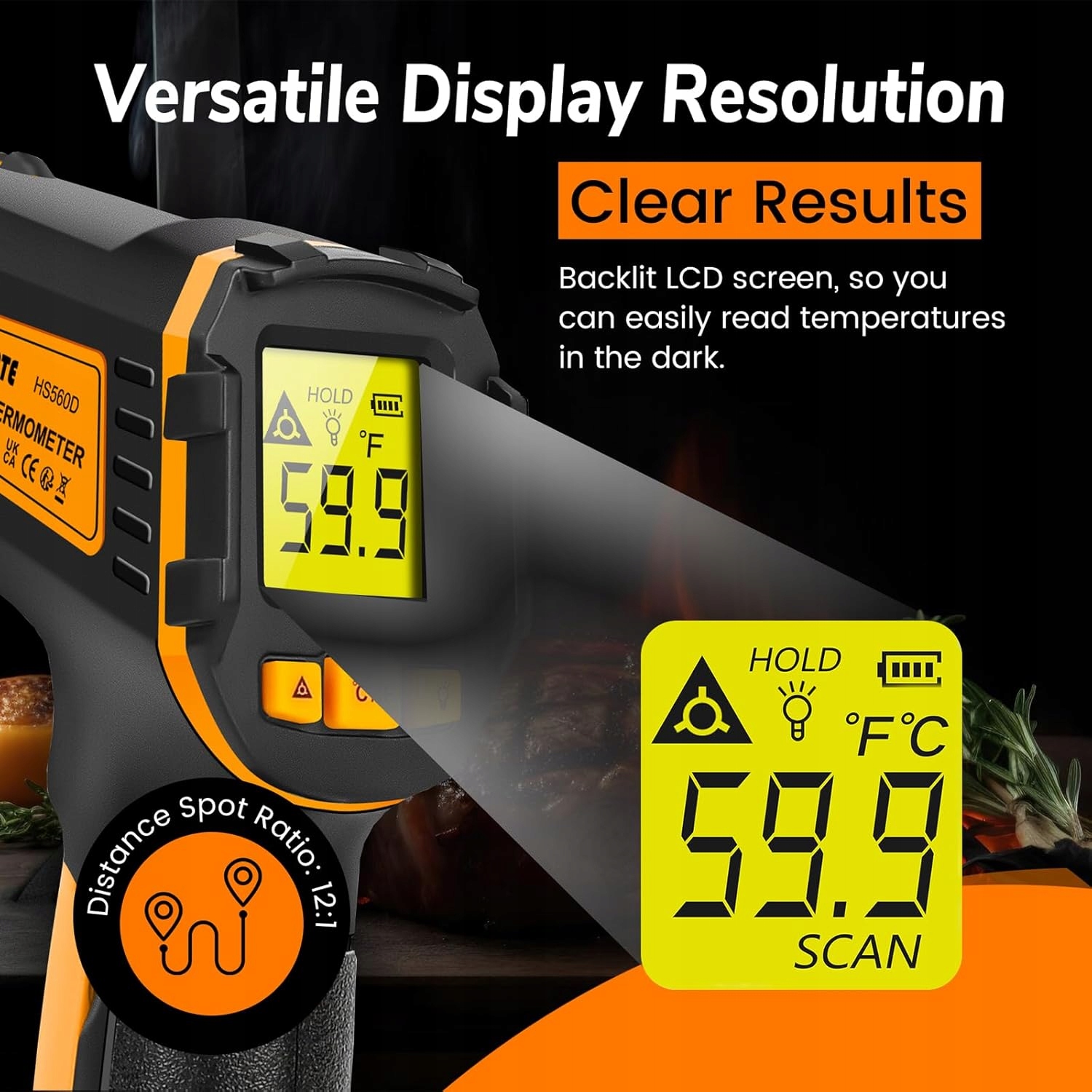 БЕЗОПАСНОЕ ИЗМЕРЕНИЕ ТЕМПЕРАТУРЫ Инфракрасный термометр для мяса Этот бесконтактный термометр, созданный с учетом требований безопасности, позволяет измерять температуру на расстоянии, что идеально подходит для опасных или тяжелых случаев. -Доступные территории. Инфракрасный термометр для мяса Идеально подходит для промышленного или домашнего использования, обеспечивая безопасность без ущерба для точности.