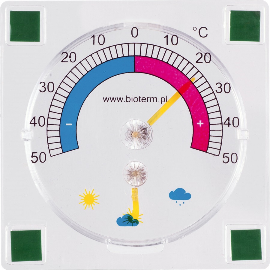 Биметаллический термометр квадратной формы из прозрачного материала. Шкала напечатана непосредственно на пластике. Дополнительную функцию выполняет гигрометр (печать внизу термометра). Это также биметаллический счетчик. По краям термометра имеются кусочки клейкой ленты, что делает термометр очень устойчивым при прикреплении.