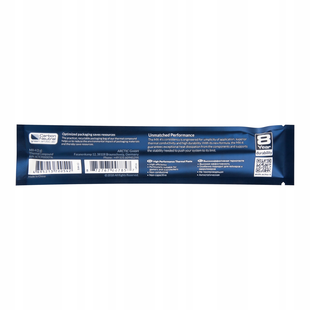 Паста ARCTIC MX-4 состоит из микрочастиц углерода, что гарантирует чрезвычайно высокую теплопроводность. Тепло, выделяемое процессорами и графическими процессорами, рассеивается быстро и эффективно даже в случае разогнанных компонентов.