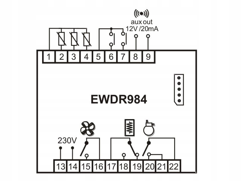 Электронный программируемый контроллер процесса охлаждения и заморозки с тремя контактами реле; управление компрессором, управление вентилятором, управление оттайкой, аварийная сигнализация, для монтажа на DIN-рейку.