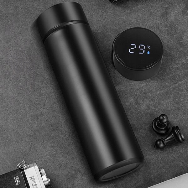 - имеет встроенный в крышку термометр со сменной батарейкой CR2032, который показывает температуру напитка при прикосновении к дисплею.