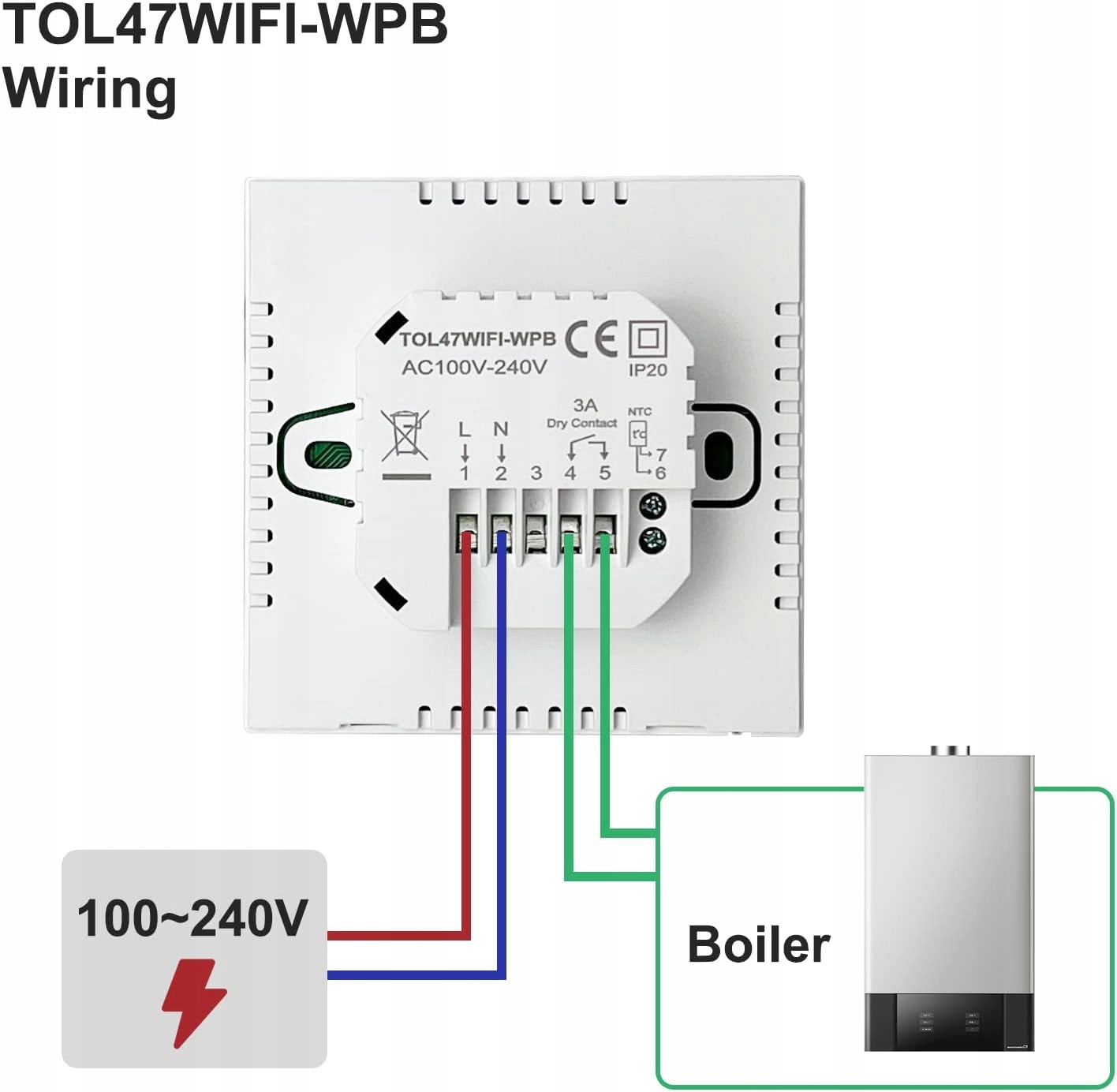 TOL47-WIFI-WP используется для управления насосом, клапаном и приводами, нормально закрытыми или нормально открытыми и т. д., подходит для водяного теплого пола.