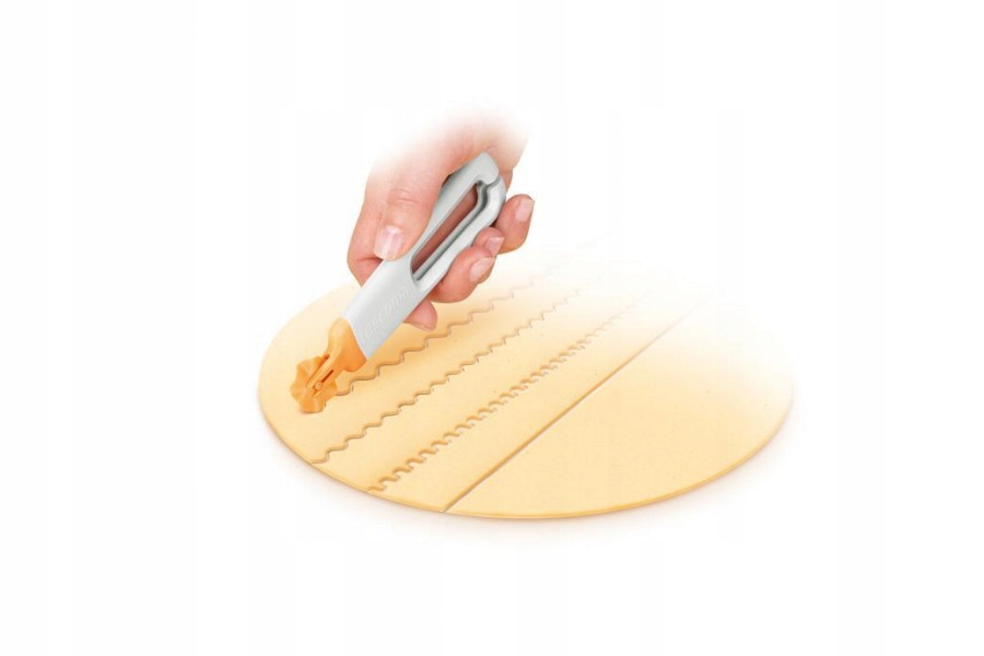 Кратчик изготовлен из прочного пластика. Набор включает в себя четыре заменяемых режущих диска : три с волнистым краем и один с простым лезвием.