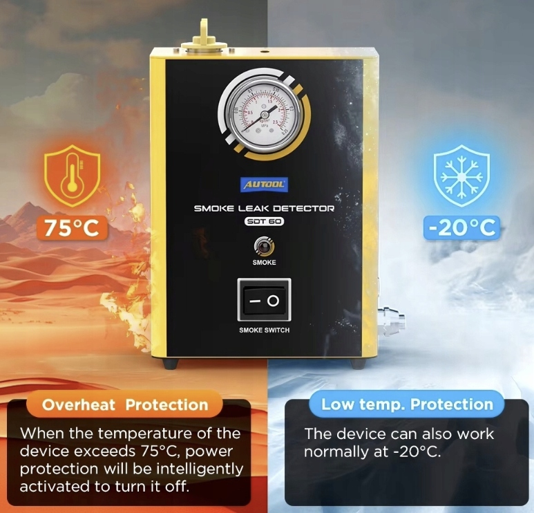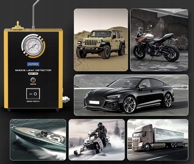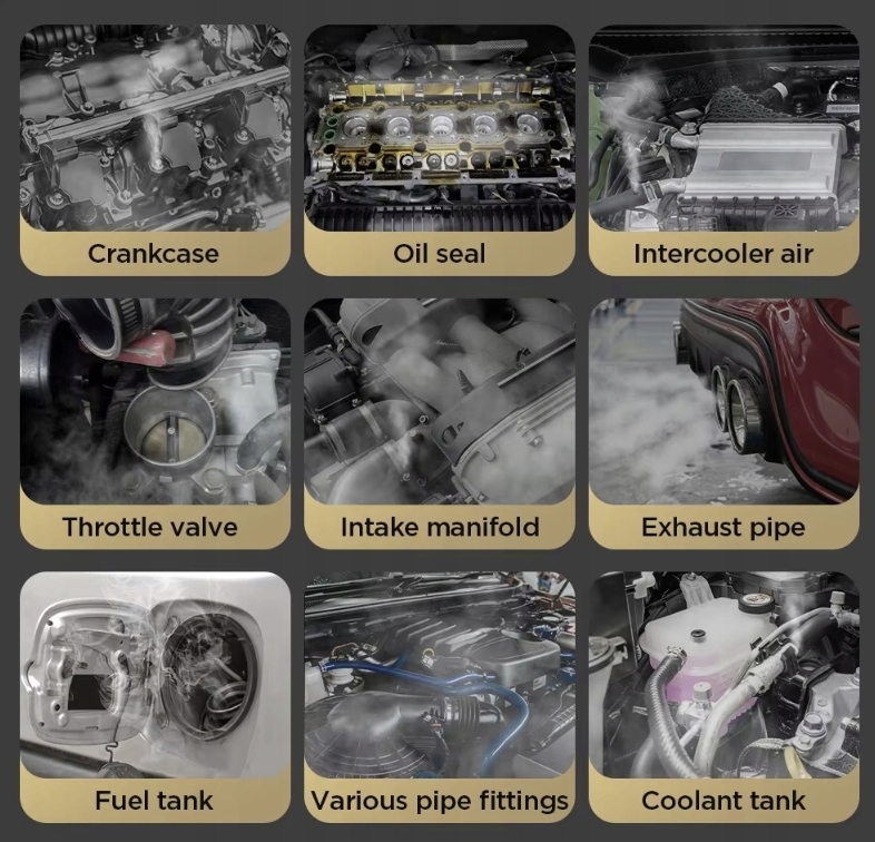 Профессиональный автоматический течеискатель труб, шлангов, соединителей и установок с использованием генератора дыма. Это поможет нам быстро и точно обнаружить утечки в трубопроводных системах за считанные минуты. Возможность использования устройства для проверки системы впуска, проверки выхлопной системы, проверки системы охлаждения, проверки герметичности автомобиля, проверки системы топливного бака, проверки различной трубопроводной арматуры.