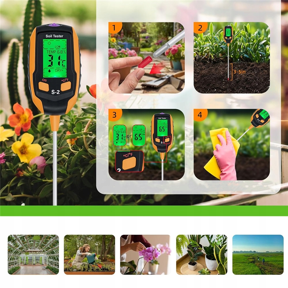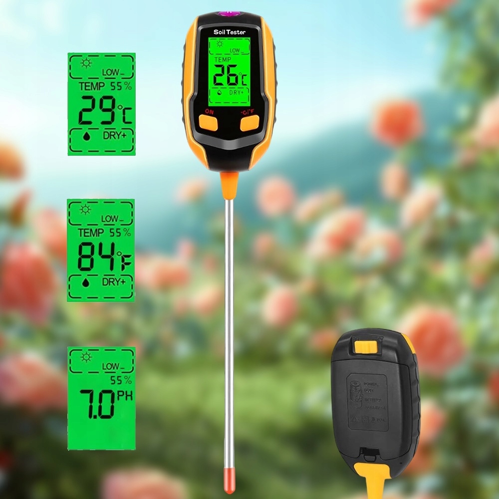 📊 Этотметр pH почвы 5-в-1 измеряет pH, влажность, солнечный свет, интенсивность света и температуру, предоставляя ключевые данные о росте растений.
