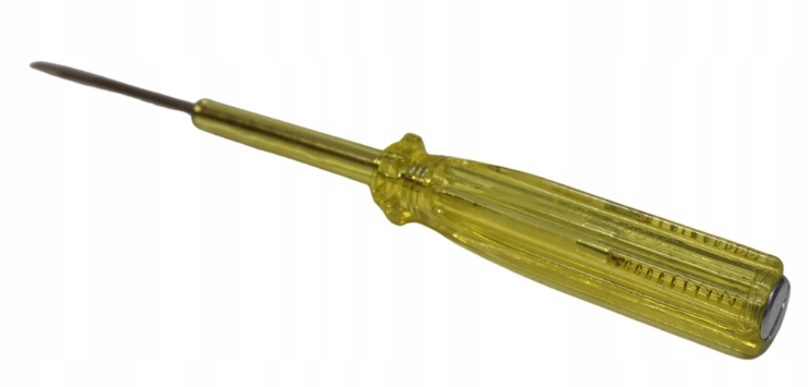 Тестер изготовлен из прозрачного желтого пластика, благодаря которому мы имеем хорошую видимость контрольного диода. Идеально заточенный и прочный кончик отвертки позволит затянуть любой винт розетки или выключателя.