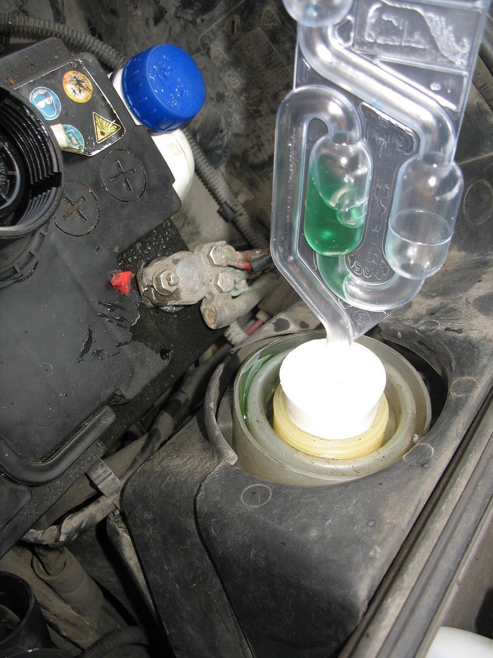 На фото видно изменение цвета реакционной жидкости с синего на зеленый в дизельном двигателе – это означает повреждение прокладки ГБЦ или головки