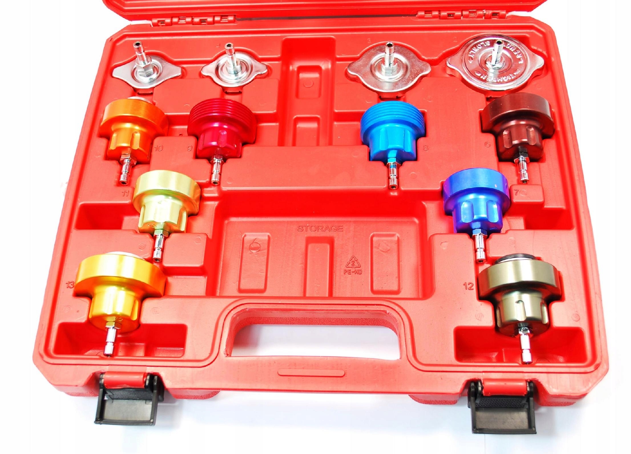 Профессиональный течеискатель системы охлаждения и отопителя.Применяется при работах на легковых автомобилях, микроавтобусах и грузовых автомобилях. Дополнительно в комплект входит термометр на длинной ножке, который вставляем в радиатор. Это позволяет проверить работоспособность термостата. В комплект входят 12 заглушек для различных типов радиаторов, которые крепятся к помпе с помощью системы быстрого соединения.