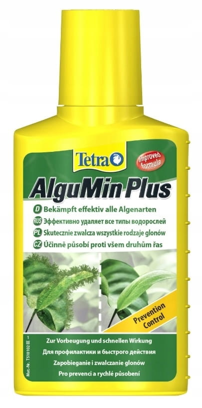 Оптимальная защита от водоросли: Водоросли уродуют аквариум и могут в долгосрочной перспективе препятствовать росту растительности и нарушать биологический баланс в аквариуме. Тетра АлгуМин Плюс* Эффективно борется со всеми видами водорослей и щадит всех обитателей аквариума, растения и микроорганизмы при использовании по назначению. Жидкая формула позволяет бороться с водорослями, поскольку высокая концентрация активного вещества воздействует на метаболизм водорослей и эффективно предотвращает их развитие. Поскольку активное вещество сразу же попадает в аквариумную воду, Тетра АлгуМин может быстро бороться с водорослями. Продукт не обесцвечивает аквариумную воду. Тетра АлгуМин Плюс подходит для всех пресноводных аквариумов. При использовании продукта аквариум следует аэрировать, например, с помощью аквариумного насоса Tetra APS, чтобы обеспечить необходимое количество кислорода. Мертвые водоросли следует удалять механически, с помощью сачка, чтобы они не оказывали негативного влияния на качество воды. После обработки, чтобы предотвратить рост водорослей в долгосрочной перспективе, следует снизить содержание питательных веществ, таких как фосфаты и нитраты, например. с помощью Тетра ИзиБаланс.