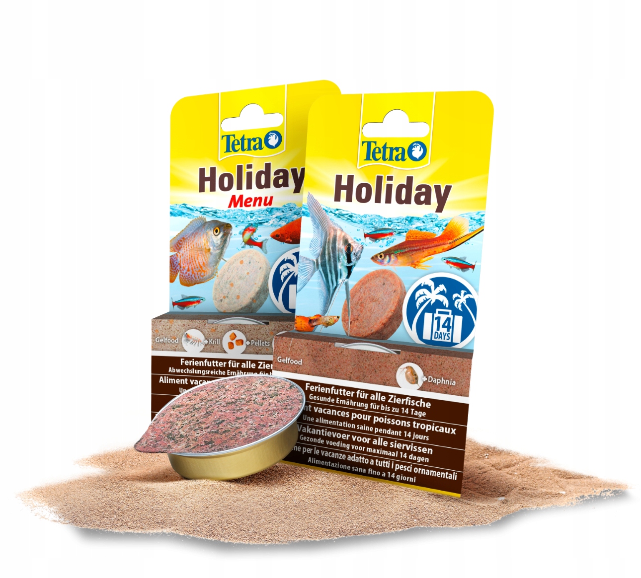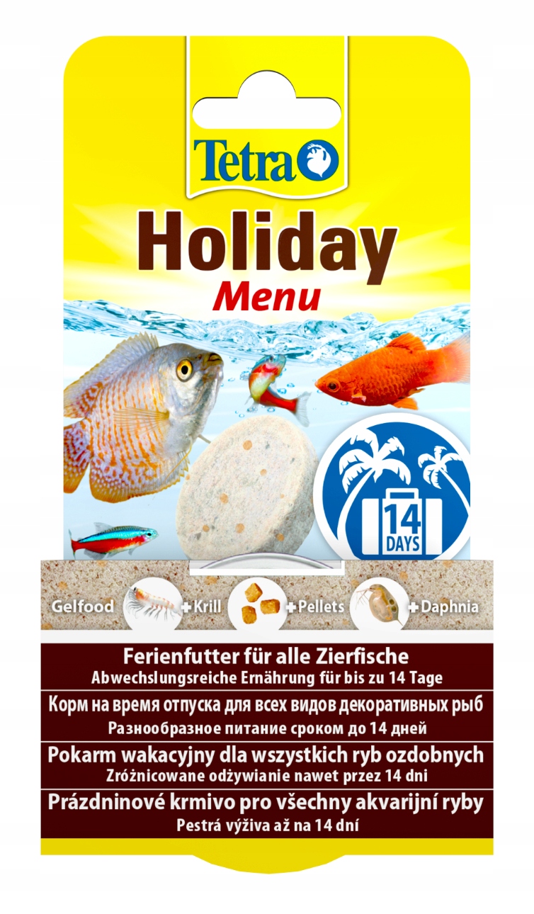 Благодаря Tetra Holiday у аквариумистов нет необходимости отказываться от спонтанных поездок на выходные или даже более длительные каникулы. Кормовой блок содержит все необходимые питательные вещества, такие как гранулы, вкусная дафния (3,5%) и криль (1,2%).