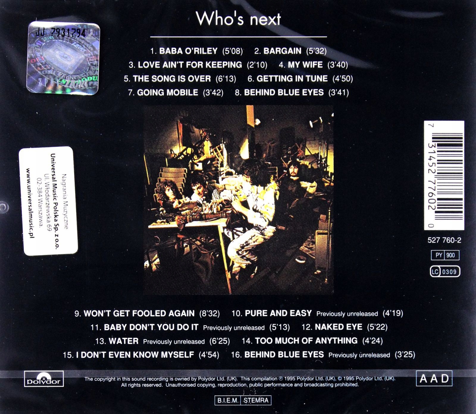 Просматривая «THE WHO: WHO'S NEXT [CD]», вы можете быть уверены, что данный товар из каталога «[rubrica_name]» будет доставлен из Польши и проверен на целостность. В цене товара, указанной на сайте, учтена доставка из Польши. Внимание!!! Товары для Евросоюза, согласно законодательству стран Евросоюза, могут отличаться упаковкой или наполнением.