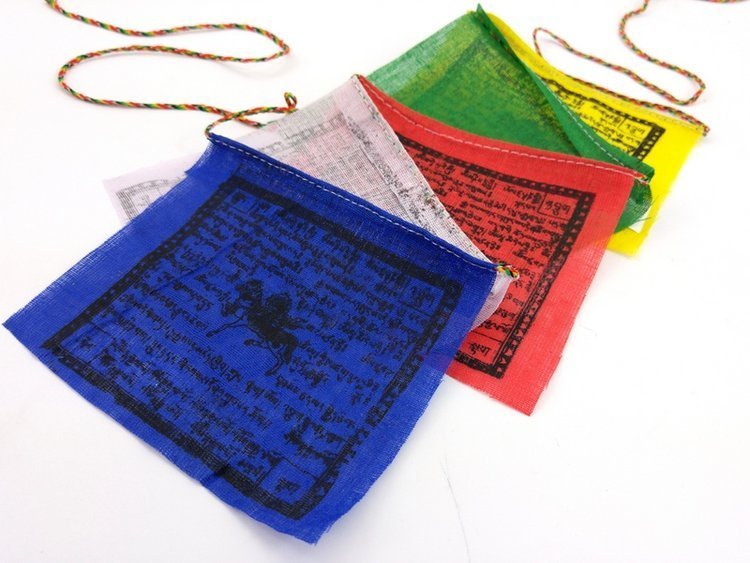 Оригинальные тибетские флаги «Лунг Та». В тибетском буддизме они имеют большое ритуальное значение. Молитвы, написанные на флагах, разносятся ветром по четырем сторонам света. Обычай их подвешивания — одна из древнейших религиозных практик в Тибете. Флаги белого, красного, синего, желтого и зеленого цветов. С изображением лошади они символизируют скорость, выносливость и радость жизни.