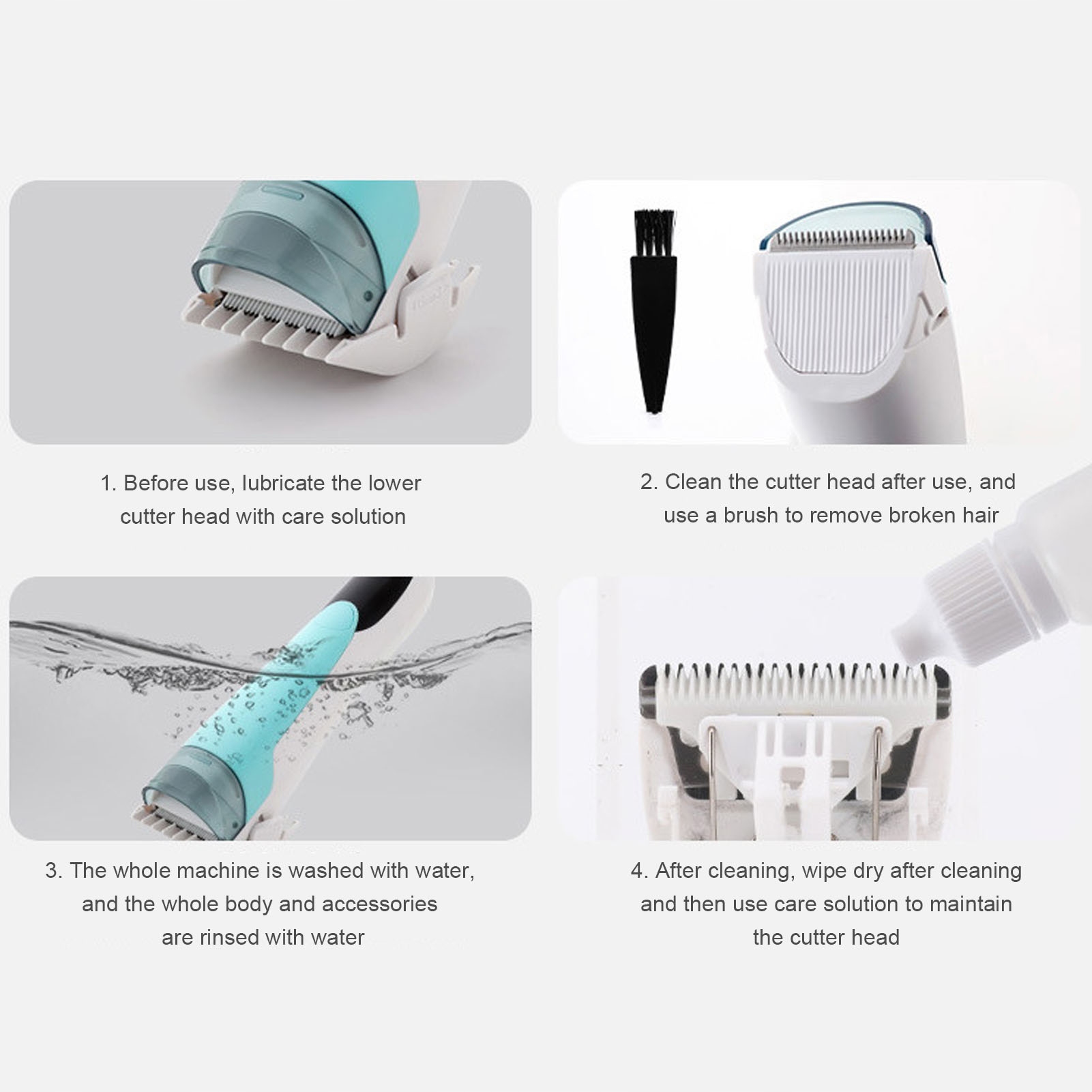 - Чистка и уход: перед использованием смажьте режущую головку раствором для ухода, очистите режущую головку после использования, используйте щетку для удаления сломанных волос, промойте машину и аксессуары чистой водой, после очистки вытрите насухо, затем используйте раствор для ухода за режущей головкой.