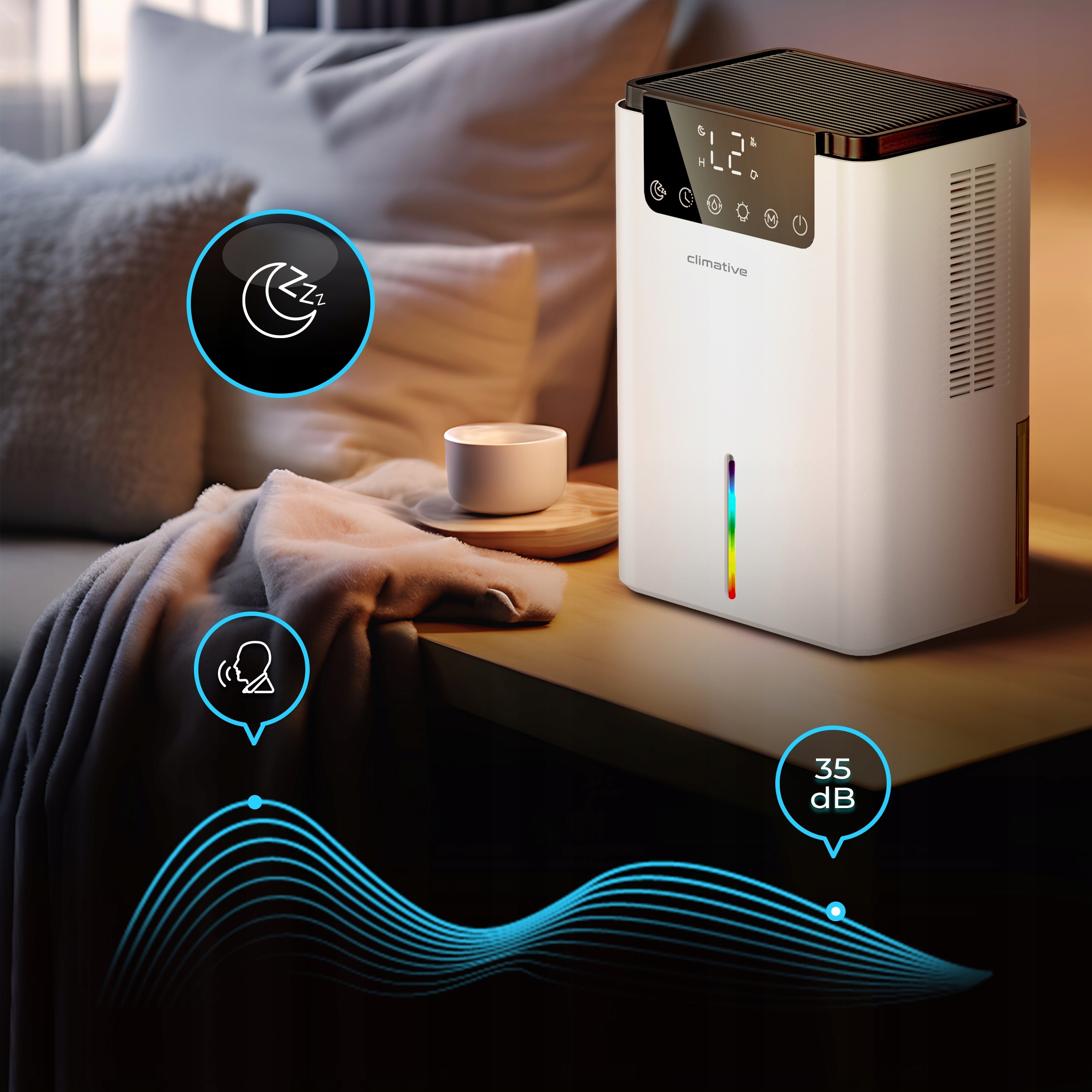 Осушитель воздуха Climative LUXE работает исключительно тихо, что делает его идеальным для спальни или детской комнаты. В ночном режиме он автоматически снижает скорость воздушного потока до минимальной (L1) и отключает дисплей, обеспечивая спокойный сон без шума и света.