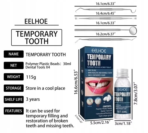 - Безопасная смола: временный комплект для ремонта зубов, изготовленный из высококачественного материала смолы, не -токсичный и безвредный, который не повреждает зубы, позволяет легко использовать.