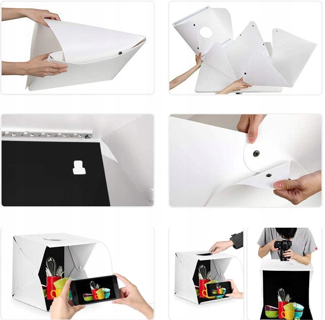 Дом или студия: бестеневая палатка – это основной аксессуар для создания фотографий товаров без резких теней. Представьте свою вещь в лучшем свете. За качество освещения отвечают две светодиодные ленты с большим количеством ярких диодов цветов, близких к естественным. Для их питания все, что вам нужно, это аккумулятор, компьютер, ноутбук или сетевое зарядное устройство 5 В/1 А. Просто подключите его к USB-порту, и палатка загорится на полную мощность. Размер палатки настолько универсален, что в нее легко поместится большинство мелких предметов. В предложение также входят палатки большего размера. Проверьте, какой из них соответствует вашим потребностям.
