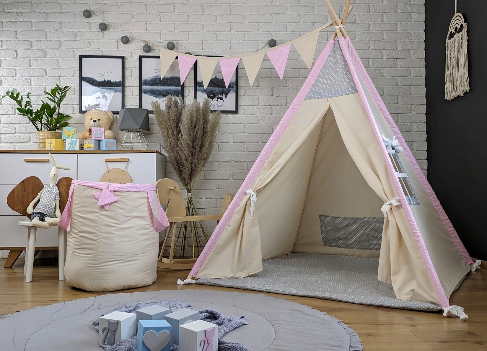 Палатки-типи можно комбинировать с другими товарами нашей марки, такими как постельное белье, корзина для игрушек и гирлянды, благодаря чему можно создать оригинальное оформление детской комнаты.