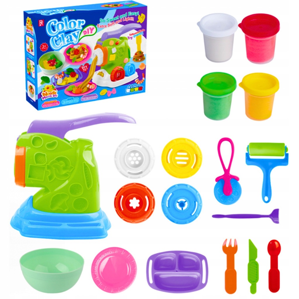 - Состав набора: машина для макарон, 4 насадки для придания формы, 4 цветных пластилина, нож, ложка, вилка, цилиндр, лопаточка, нож для пиццы, миска, тарелка и тарелка с отделениями.