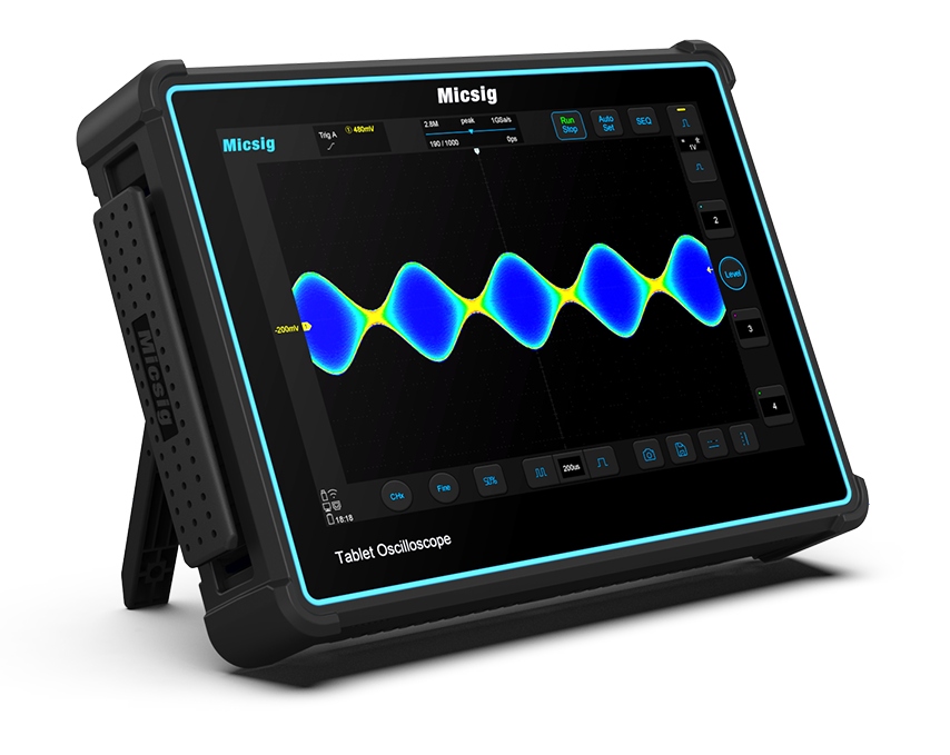 Портативный планшетный осциллограф от Micsig — это цифровой осциллограф с 10,1-дюймовым ЖК-дисплеем и сенсорным экраном. Прибор имеет четыре канала и характеризуется хорошими измерительными параметрами: полоса пропускания 200 МГц, частота дискретизации 2 Гвыб/с и буфер памяти 220 Мбит/с. Он имеет множество выходов, позволяющих подключаться к другому устройству через USB 3.0 и 2.0, USB Type C, HDMI и WiFi. Дополнительно осциллограф оснащен разъемом питания и аккумулятором емкостью 7500 мАч, что позволяет работать до 5 часов на одном заряде. Также в корпусе имеется подставка, позволяющая расположить осциллограф под углом 45° для удобной работы.
