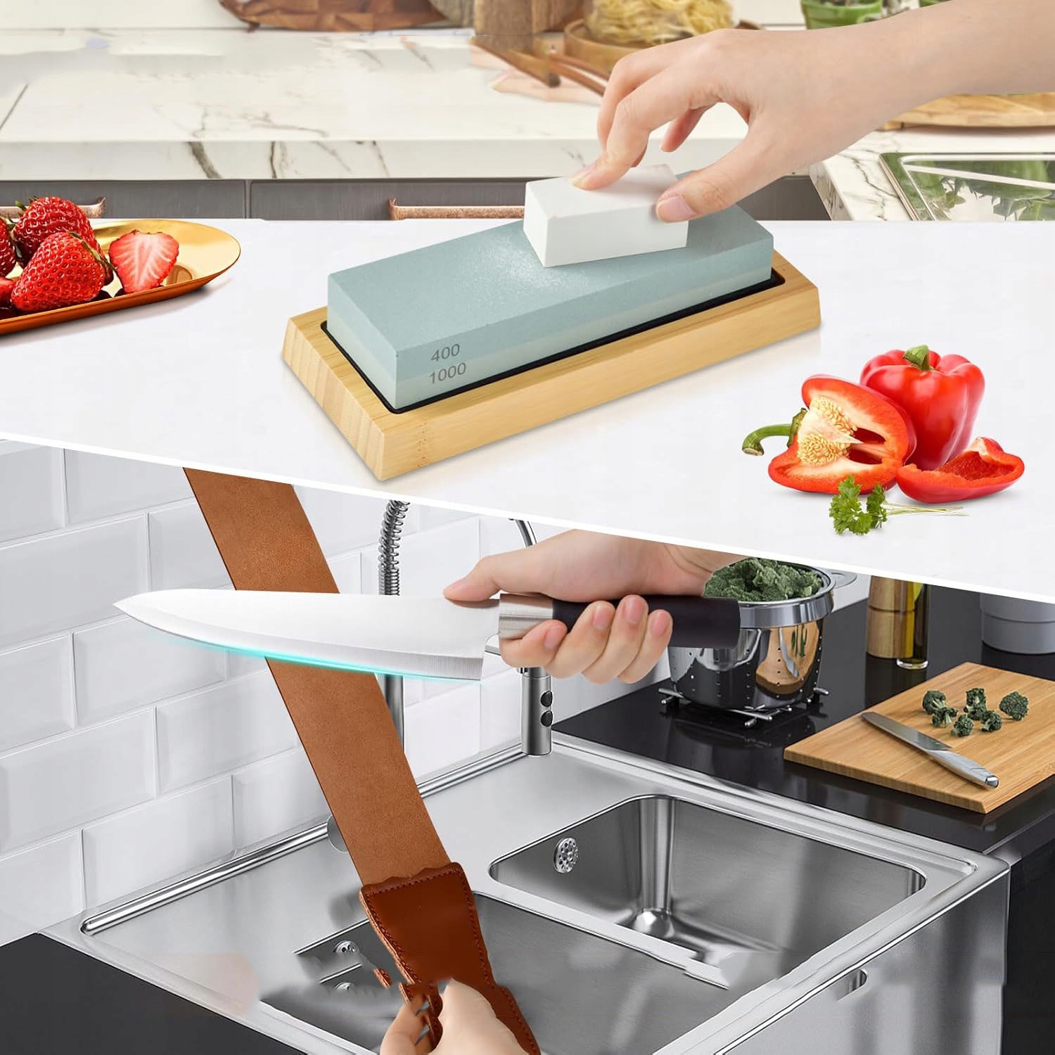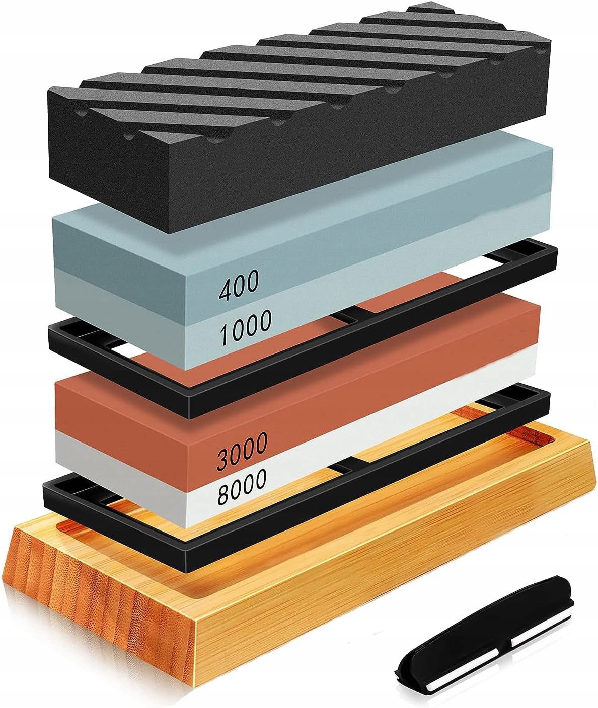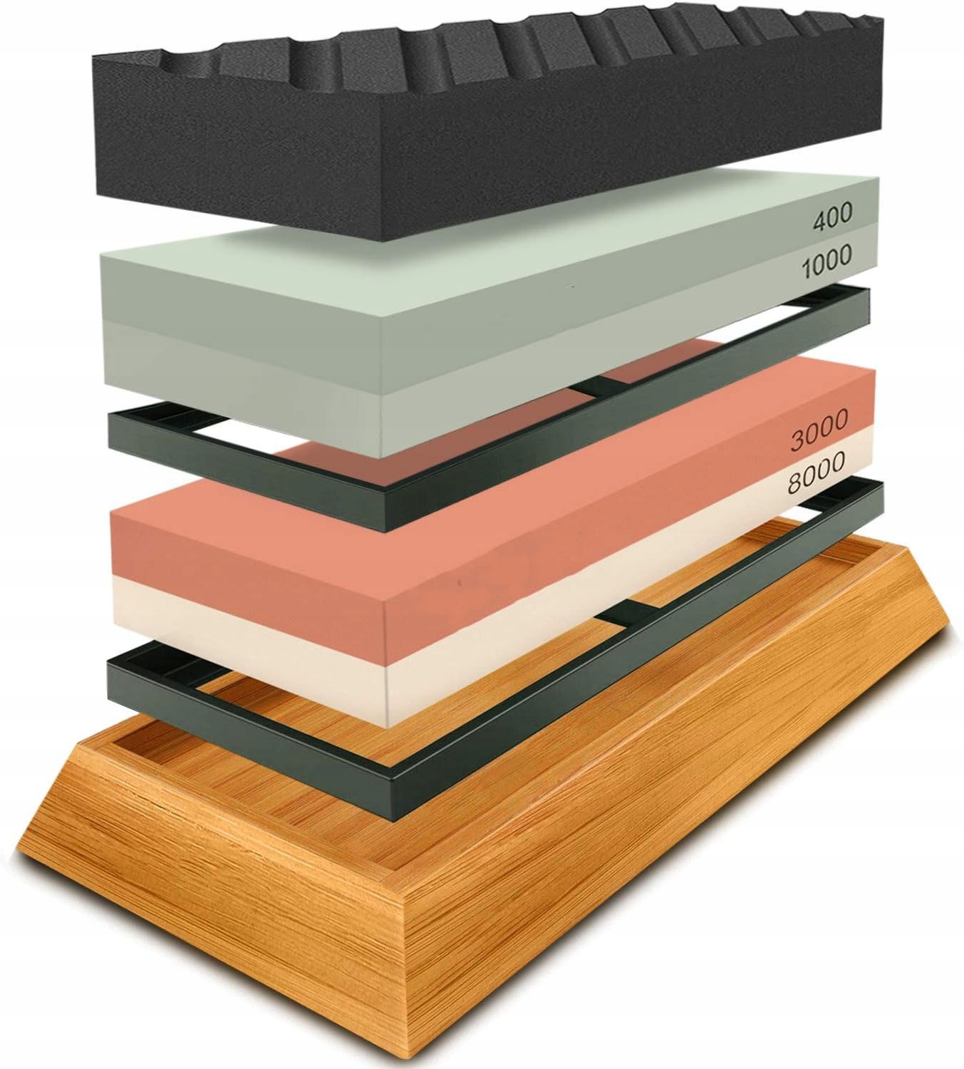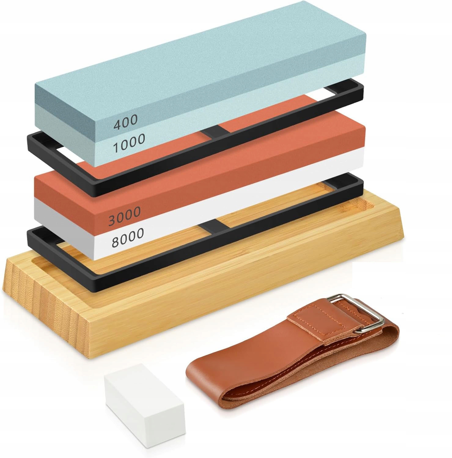 Высокое качество - Полный набор шлифовальных камней с бамбуковой основой и нескользящей подкладкой, угловой направляющей, выравнивающим камнем, силиконовой ручкой и кожаным ремешком. Изделие долговечно и соответствует всем стандартам.