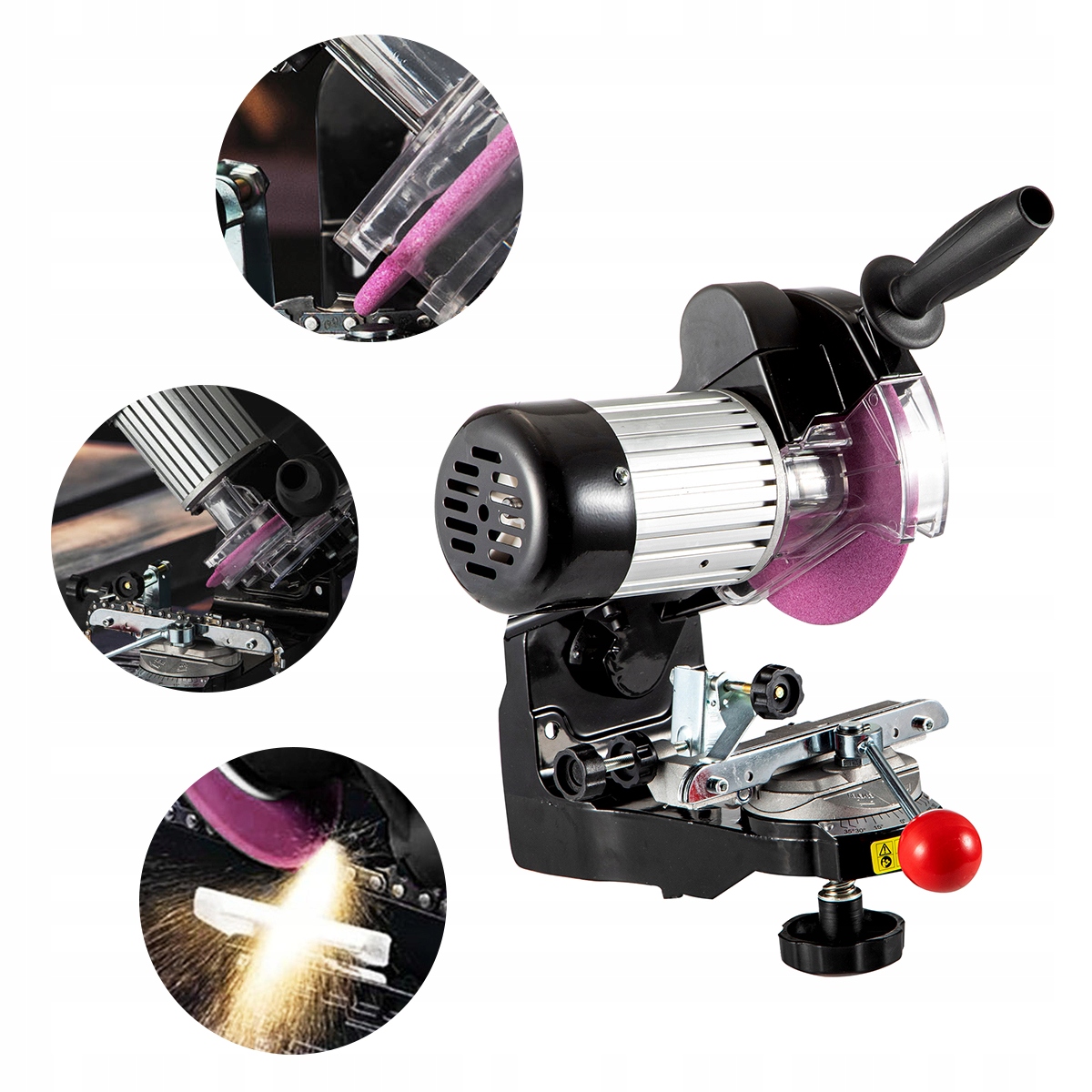 Точилку для электрической бензопилы можно использовать для полировки, заточки и шлифования предметов. Вы можете регулировать угол, машина подходит для цепей с шагом 1/4", 0,325", 3/8" и 0,404".