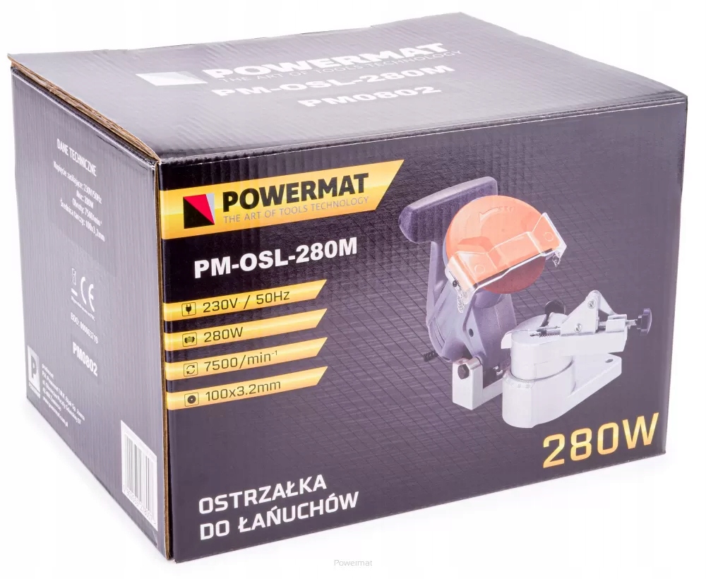 Цепная точилка POWERMAT с реальной мощностью 280 Вт ускоряет точильный камень до скорости 7500 оборотов в минуту.
