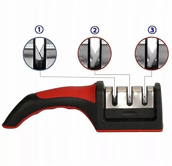 Ручная точилка для ножей имеет 3 головки с различными функциями заточки.