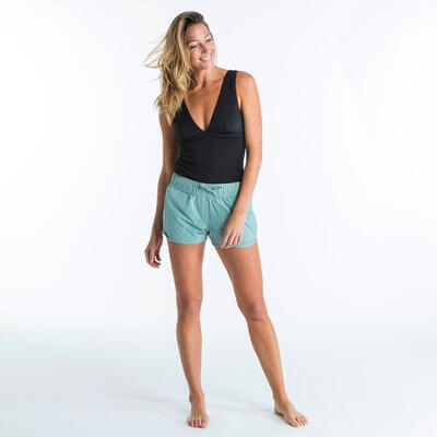 Команда серферов разного уровня подготовки создала этот женский купальник для начинающих серферов. Женственный верх купальника-танкини с V-образным вырезом закрывает цельный купальник, но позволяет определить размер верха и низа отдельно. Съемные вставки.