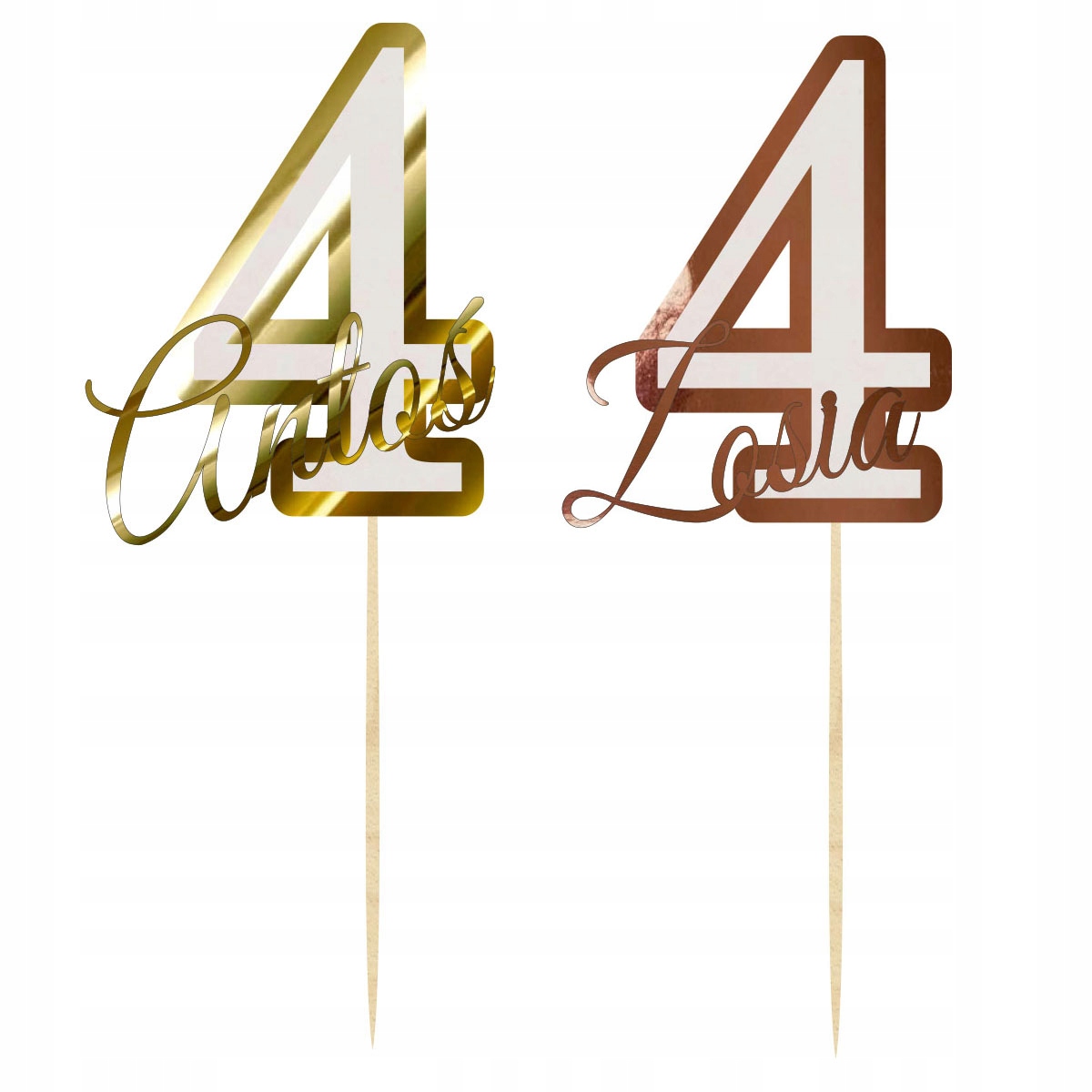 Топпер номер на вершине 4, посвященный годовщине, дню рождения, юбилею, вечеринке. Оригинальное украшение подчеркнет неповторимость торжества и станет прекрасным акцентом на торте или букете. Предложение включает два цвета: зеркальное золото или розовое золото. Номер также можно использовать в качестве номера стола, украшения подарочных корзин или подарков на день рождения. Топпер может содержать имя из 1 слова. На вершине мы можем разместить любую цифру от 0 до 9.