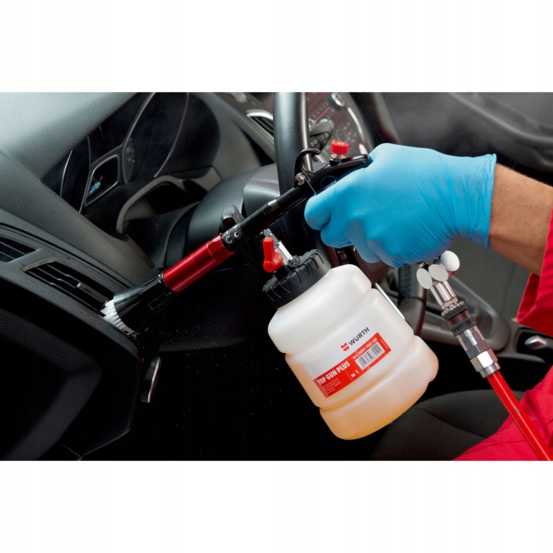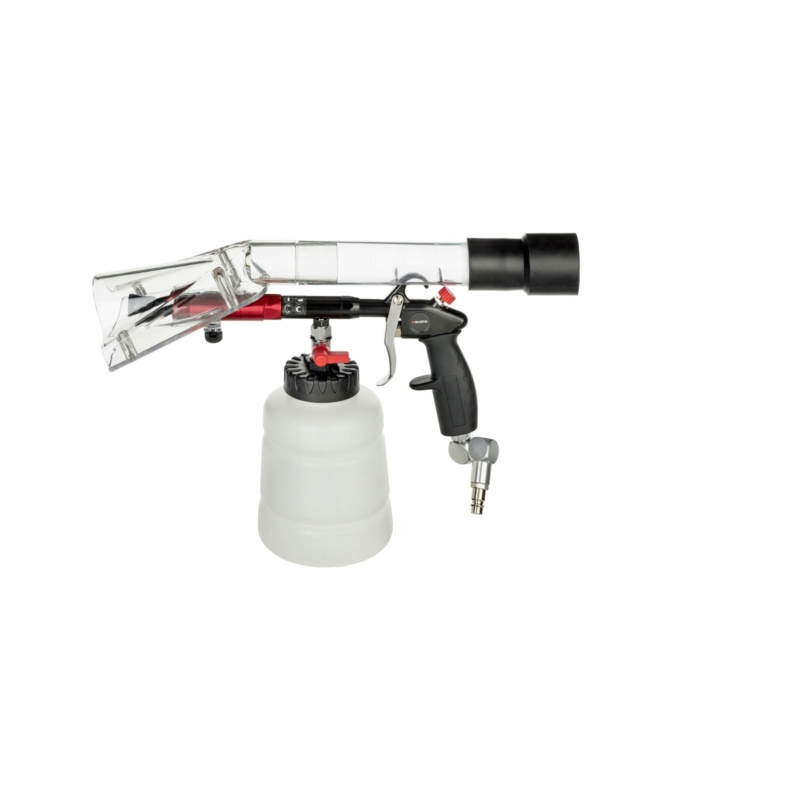 предварительно проникает на поверхность для очистки с помощью очистителя или кисти вакуума. Затем заполните верхний контейнер с пистолетом подходящим чистящим агентом в соответствии с рекомендуемыми пропорциями смешивания и подключите верхний пистолет с сжатым воздухом и мокрым всасывающим устройством. Переместите шаровой клапан в вертикальное положение (ON) и медленно очищайте материал, делая колесные движения. Чтобы высохнуть, переместите шаровой клапан обратно в вертикальное положение (выключение), в котором только воздух будет течь через чистящий пистолет. Если материал все еще влажный, влага может быть удалена тканью.