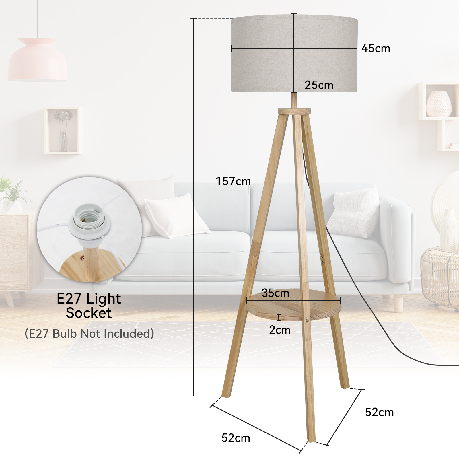 Современный деревянный торшер с абажуром на трех ножках и полкой — стильное семейство светильников, изготовленных из дерева высочайшего качества.