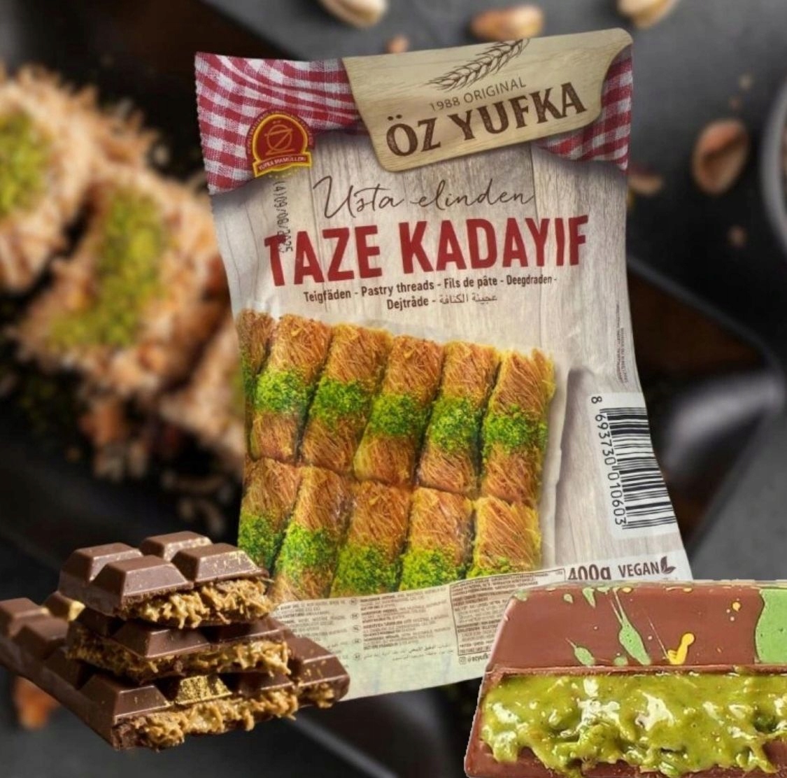 Fresh Kadayif Cake (katifi) имеет форму тонких макаронов, нить - отличная основа для арабских десертов. Тесто можно положить с помощью орехов, сыра. После выпечки тесто - хрустящий, нейтральный вкус, поэтому вкус подготовленного десерта в значительной степени зависит от используемых добавок. Dubai Chocolate заполнен хрустящими нитьми теста Kadayif