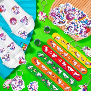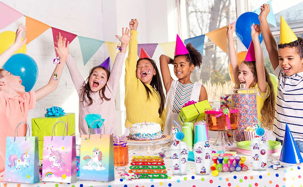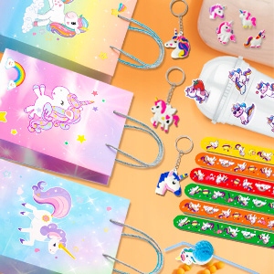 - Набор сувениров для вечеринки по случаю дня рождения единорога🦄 В этот набор сувениров для вечеринки по случаю дня рождения единорога входят 12 подарочных пакетов с единорогами, 12 брелоков с единорогами, 12 детских браслетов с единорогами, 12 шт. штампы с единорогами, 12 колец с единорогами для детей, 50 наклеек с единорогами для детей и т. д. сувениры для вечеринки в честь дня рождения единорога.